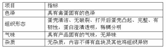 為貫徹預(yù)防為主的方針和執(zhí)行《中華人民共和國食品衛(wèi)生法》,加強(qiáng)對(duì)蛋與蛋制品的衛(wèi)生管理,提高蛋品質(zhì)量,保障人民身體健康,國家制定了蛋品衛(wèi)生標(biāo)準(zhǔn)。按照衛(wèi)生部提出的、原技術(shù)監(jiān)督局《鮮蛋衛(wèi)生標(biāo)準(zhǔn)》(GB2748—2003),鮮蛋的感官指標(biāo)和理化指標(biāo)應(yīng)達(dá)到下列要求。